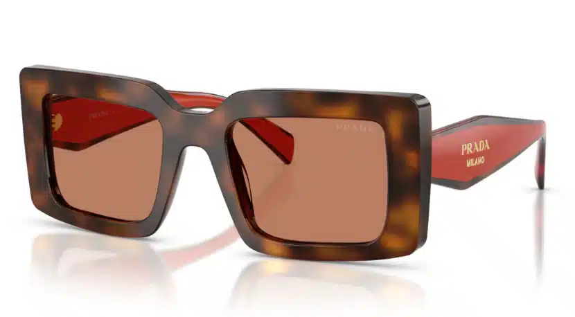 El acabado en carey marrón añade profundidad y calidez, mientras que las varillas con interior en tono rojo crean un contraste elegante y distintivo. El detalle del logo Prada Milano refuerza su identidad exclusiva y de alta gama.